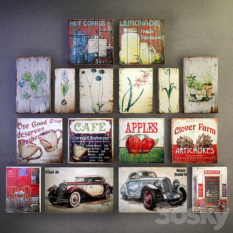 Декоративные таблички - картины можно использовать в качестве настенного декора как для жилых помещений (кухни, гостиной и др.), так и для общественных (кафе, ресторанов и др.). Гармонично впишется в интерьер, оформленный в стиле лофт, прованс, винтаж, кантри, английский и скандинавский стиль. Состав сборника (слева-направо, сверху-вниз): 1 превью: 1) "Стильная кухня" - "Hot Coffee" (200 х 200 х 20 мм) 2) "Стильная кухня" - "Lemonade" (200 х 200 х 20 мм) 3) "Прованс" (150 х 250 х 20 мм) 4,5,6,7) Коллекция "Botanic" - интерьерные панно в ботаническом стиле со старинными, винтажными иллюстрациями цветов (150 х 200 и 90 х 200 мм) 8) "Прованс" (150 х 250 х 20 мм) 9) "Кофейный микс" - "One Good Cup" (200 х 200 х 20 мм) 10) "Кофейный микс" - "Cafe" (200 х 200 х 20 мм) 11) "Для уютной кухни" - "Apples" (200 х 200 х 20 мм) 12) "Для уютной кухни" - "Artichokes" (200 х 200 х 20 мм) 13) "Париж" (150 х 200 мм) 14, 15) "Wikov 40" и "Walter Junior" - панно настенное на холсте Ретро-авто (200 х 300 мм) 16) "Париж" (150 х 200 мм) 2 превью: 17, 18, 19) "Столовые приборы" - настенное деревянное панно - триптих (400 х 200 х 8 мм 3 превью: 20) "Black dog" (200 х 200 х 20 мм) 21) "Догги-Авиатор" (300 х 300 х 15 мм) Авторы: http://www.livemaster.ru/ledaksdecor http://www.livemaster.ru/olgagener В архиве: Max, FBX, mat, текстуры Масштаб: мм (модели реальных размеров)