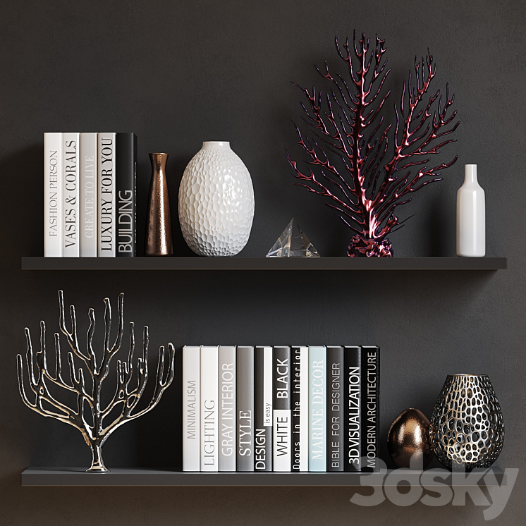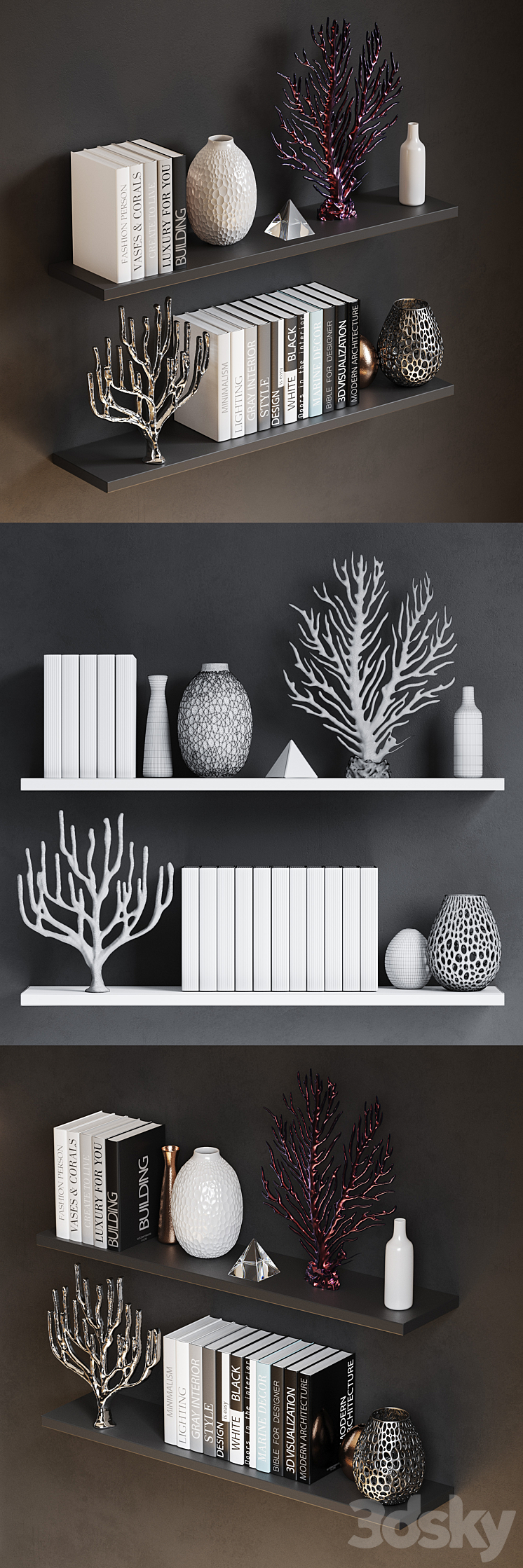 Декоративный набор состоит из кораллов, книг, ваз, призмы, полок. Всего: 26 предметов: Книги - 16шт Вазы - 5шт Кораллы - 2шт Полки - 2шт Призма - 1шт Pivot на нуле внизу каждой модели В архиве имеются модели с материалами для Corona max2013+FBX 1,309,555 - polys 664,952 - verts Подойдет для декорирования интерьера Приятного использования :)