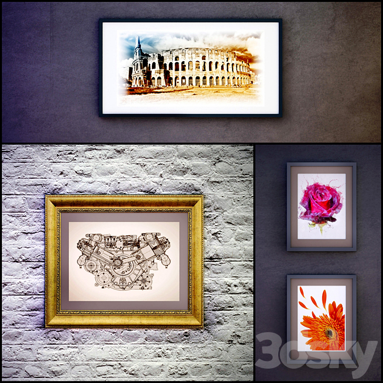 Состав сборника: 1) Серия "чёрно-белое": триптих - отпечатки пальцев (подойдёт для оформления кабинета или гостиной). 2) Серия "космос": шесть картин - планеты Марс, Меркурий, Земля, Юпитер, Луна, Нептун. 3) Картина "Колизей" 4) Картина в классической раме "Чертеж двигателя - мотор" (подойдёт для оформления интерьера в стиле лофт, индастриал). 5) Диптих "Цветы" В архиве: Max, FBX, mat, текстуры Масштаб: мм