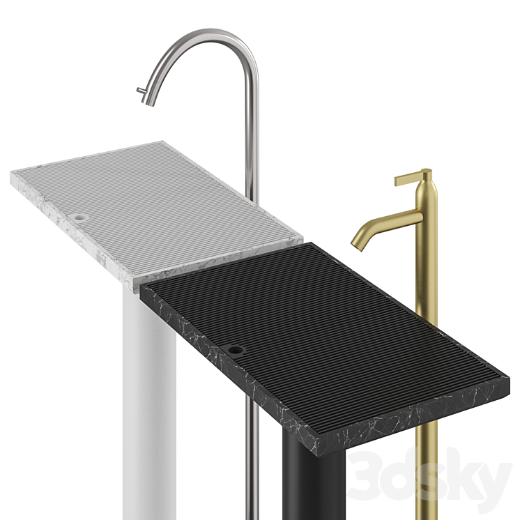 Умывальник серии «Ell» — культовый, но легкий предмет. Плоская поверхность с решеткой для волнолома также является умывальником, и они становятся единым элементом. Напольный смеситель: 1. Agass="superseo">ape MEMORY MIX 2. Agape FEZ 2